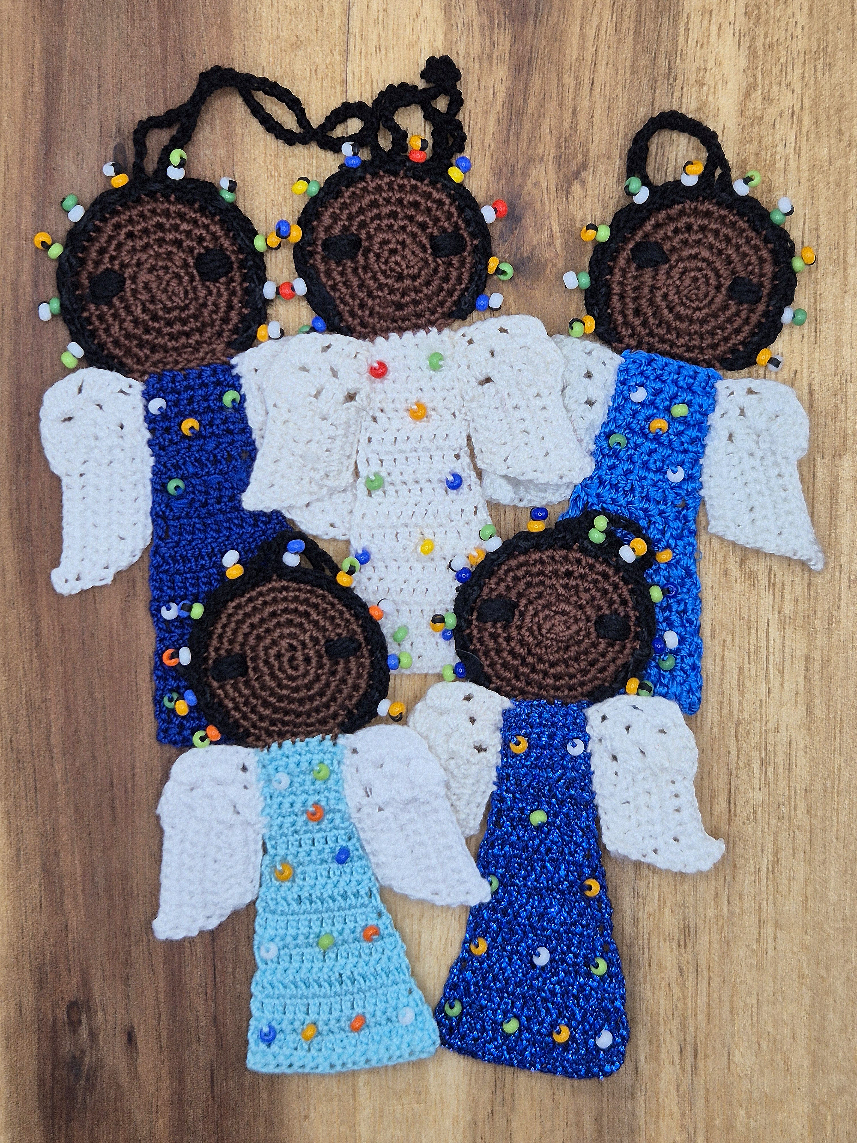 Die Perlen, mit denen die Engel geschmückt werden, sind sogenannte „Maasai-beads“, also Perlen, die auch die Maasai verwenden, um ihren traditionellen Schmuck herzustellen. Diese Perlen kaufen wir in Mombasa und jede neue Farbkombination von Perlen auf den Engeln wird von Christine Rottland eigens zusammengestellt.