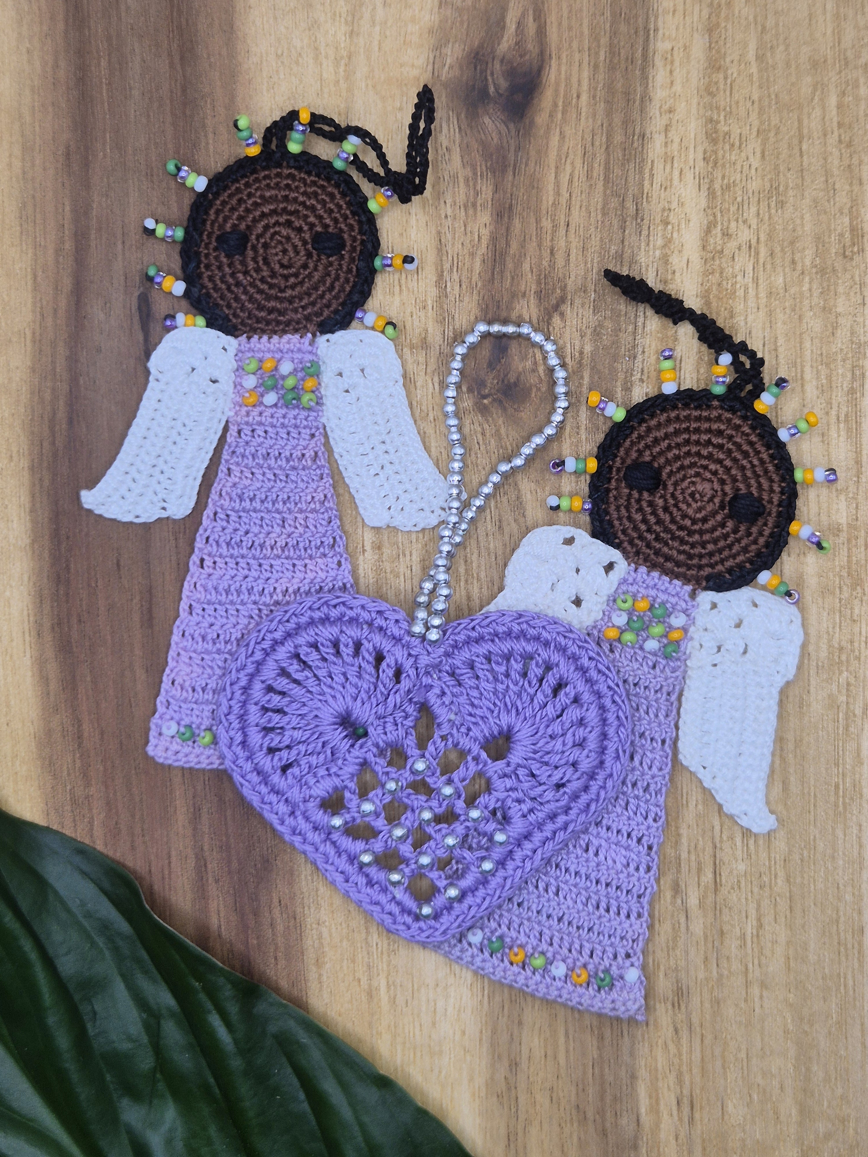 Passend zum Liebe schenken für Freunde, Familie, Bekannte und alle Anderen - für Sie zusammengestellt - zwei fliederfarbene Rasta-Engel und ein Herz in flieder.